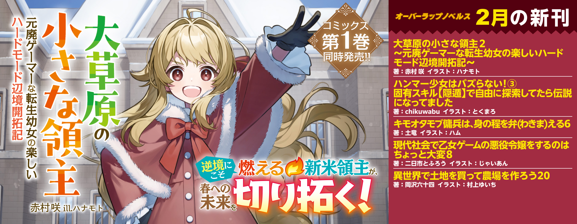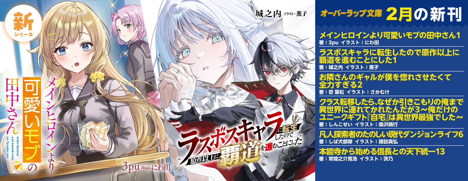 今月の新刊毎月25日発売 ノベルスf一覧 ノベルス一覧 文庫一覧 オーバーラップ文庫 オーバーラップ文庫 オーバーラップ文庫 オーバーラップ文庫 オーバーラップ文庫 オーバーラップ文庫 オーバーラップ文庫 オーバーラップ文庫 オーバーラップ文庫 オーバーラップ文庫 オーバーラップノベルス オーバーラップノベルス オーバーラップノベルス オーバーラップノベルス オーバーラップノベルス オーバーラップノベルスf 文庫 新シリーズ 死にゲー世界をクリアしたら別ゲー悪役貴族に転生しました 1 ~前世のチートと不死身の身体で、好き勝手生きます~ 著:こがれ イラスト:TEDDY レーベル:オーバーラップ文庫発売日:2026年2月25日 「強者との戦いを謳歌して、今世も目指せ最強!!!できればチートなしで!!――でも仲間のピンチには使っちゃうよね!」 文庫 新シリーズ ただの平民の使用人、実は最強の魔法士 1 ~真の実力がバレた結果、姫様たちが離してくれない~ 著:楓原こうた イラスト:小鳥遊啓 レーベル:オーバーラップ文庫発売日:2026年2月25日 魔法の才に愛された唯一の平民。しかも規格外に最強。 文庫 新シリーズ メインヒロインより可愛いモブの田中さん 1 著:3pu イラスト:にわ田 レーベル:オーバーラップ文庫発売日:2026年2月25日 クラスで一番かわいいのは隣の席のキミなんだ! 文庫 新シリーズ ラスボスキャラに転生したので原作以上に覇道を進むことにした 1 著:城之内 イラスト:薫子 レーベル:オーバーラップ文庫発売日:2026年2月25日 ラスボスの力とゲーム知識で、俺は最強の王になる! 文庫 お隣さんのギャルが僕を惚れさせたくて全力すぎる 2 著:枩 葉松 イラスト:さかむけ レーベル:オーバーラップ文庫発売日:2026年2月25日 「あたしの全部、好きにしていいから――」 特設サイト 文庫 クラス転移したら、なぜか引きこもりの俺まで異世界に連れてかれたんだが 3 ~俺だけのユニークギフト『自宅』は異世界最強でした~ 著:しんこせい イラスト:森沢晴行 レーベル:オーバーラップ文庫発売日:2026年2月25日 聖女と一緒に冒険へ出発! 孤高の女帝も敵対魔族も味方に!?クラスメイト救出作戦、ついに始動!! 特設サイト 文庫 無気力ニートな元神童、冒険者になる 4 ~「学生時代の成績と実社会は別だろ?」と勘違いしたまま無自覚チートに無双する~ 著:ぺもぺもさん イラスト:福きつね レーベル:オーバーラップ文庫発売日:2026年2月25日 元神童のニート、『黒竜の牙』の長・オルフレッドの邸宅で最強の雑用係になる!? 特設サイト 文庫 攻撃力ゼロから始める剣聖譚 6 ~幼馴染の皇女に捨てられ魔法学園に入学したら、魔王と契約することになった~ 著:大崎アイル イラスト:kodamazon レーベル:オーバーラップ文庫発売日:2026年2月25日 神話級の厄災から、迷宮都市を救済せよ 特設サイト 文庫 凡人探索者のたのしい現代ダンジョンライフ 6 著:しば犬部隊 イラスト:諏訪真弘 レーベル:オーバーラップ文庫発売日:2026年2月25日 凡人探索者のたのしい現代ダンジョンライフ、おしまい。 特設サイト 文庫 本能寺から始める信長との天下統一 13 著:常陸之介寛浩 イラスト:茨乃 レーベル:オーバーラップ文庫発売日:2026年2月25日 1609年、信長――戦車部隊で馬揃え!?ジブラルタル城下連続殺人事件! 特設サイト ノベルス 大草原の小さな領主 2 ~元廃ゲーマーな転生幼女の楽しいハードモード辺境開拓記~ 著:赤村 咲 イラスト:ハナモト レーベル:オーバーラップノベルス発売日:2026年2月25日 逆境にこそ燃える新米領主が、春への未来を切り拓く! 特設サイト ノベルス ハンマー少女はバズらない!③ 固有スキル【隠遁】で自由に探索してたら伝説になってました 著:chikuwabu イラスト:とくまろ レーベル:オーバーラップノベルス発売日:2026年2月25日 神様と天啓に導かれ、雪ん子は村と民を救う――! 特設サイト ノベルス キモオタモブ傭兵は、身の程を弁(わきま)える 6 著:土竜 イラスト:ハム レーベル:オーバーラップノベルス発売日:2026年2月25日 どうして敵も味方も僕(モブ)をつけ狙うの!? 特設サイト ノベルス 現代社会で乙女ゲームの悪役令嬢をするのはちょっと大変 8 著:二日市とふろう イラスト:じゃいあん レーベル:オーバーラップノベルス発売日:2026年2月25日 「瑠奈、お前買うのか?」お嬢様のもとに企業買収の嵐がやってくる──!? 特設サイト ノベルス 異世界で土地を買って農場を作ろう 20 著:岡沢六十四 イラスト:村上ゆいち レーベル:オーバーラップノベルス発売日:2026年2月25日 エルフが世界樹の葉でお茶作り!? 和菓子でお花見&大宴会開催!! 特設サイト ノベルスf 眠れる森の悪魔 3 禁忌×事業 著:鹿条シキ イラスト:呉々 レーベル:オーバーラップノベルスf発売日:2026年2月25日 奇跡は起きない。だから、人は禁忌を犯す。 特設サイト